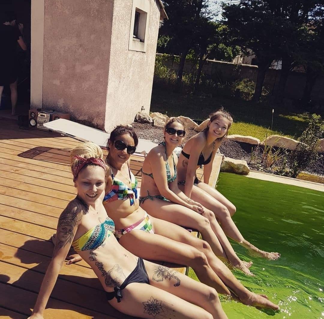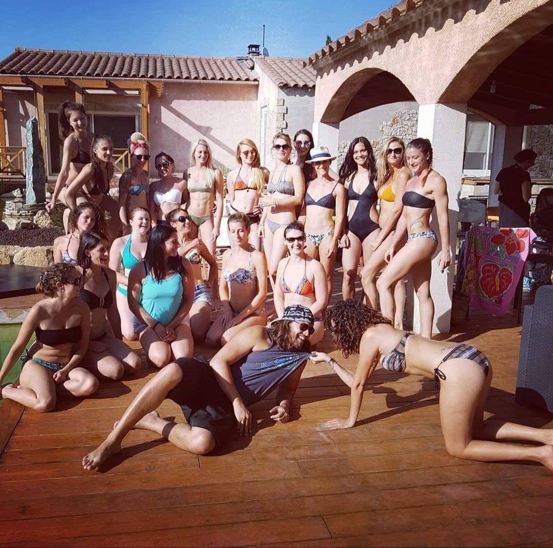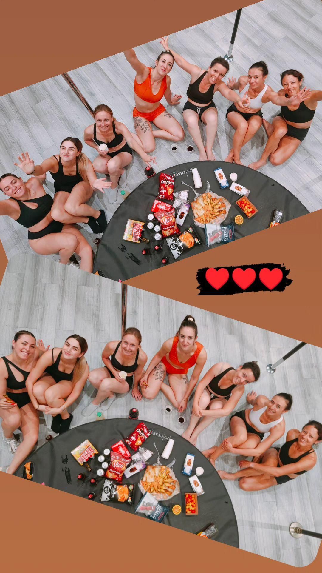 Un groupe de femmes font de la pole dance dans une salle de sport.