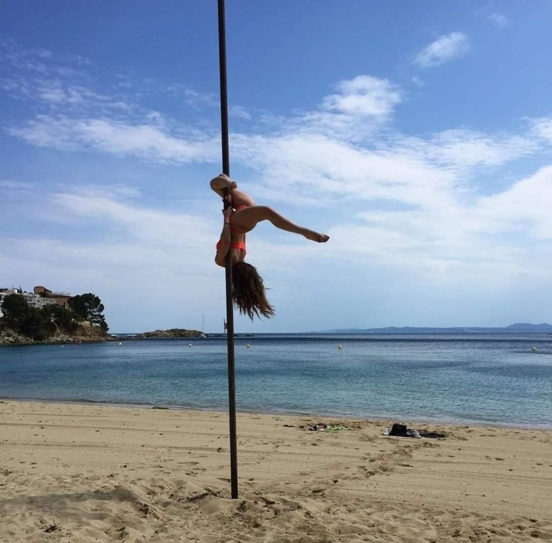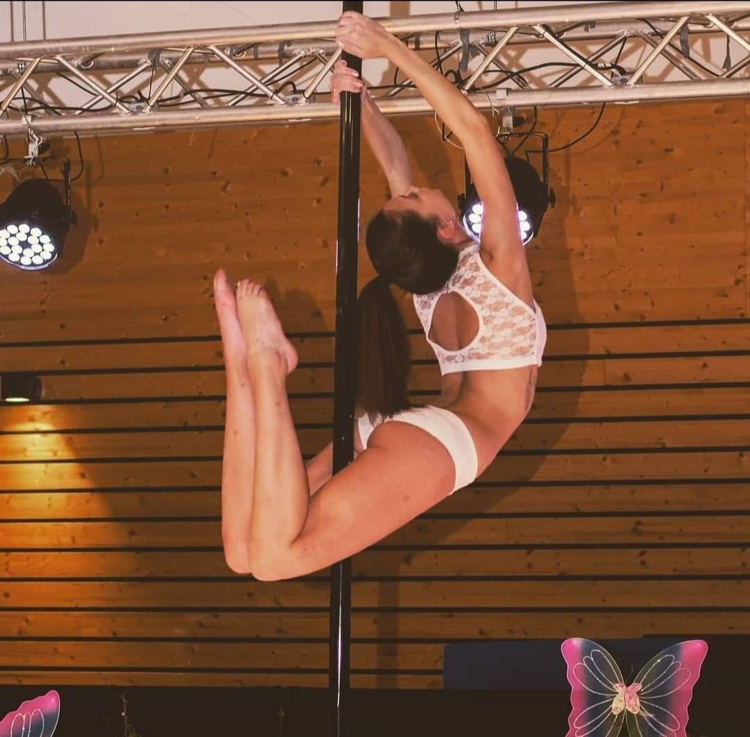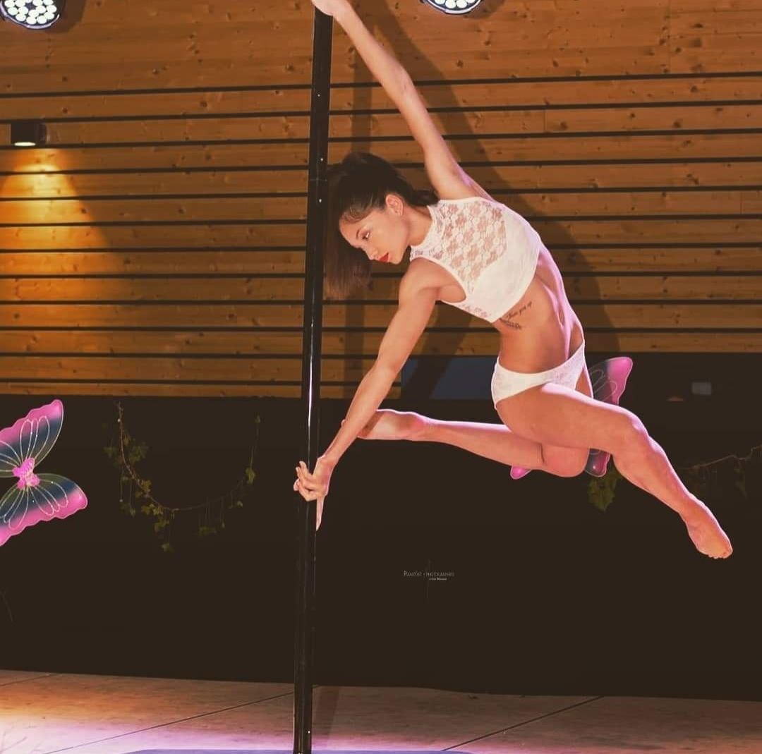 Une femme fait un grand écart sur un poteau devant une foule.