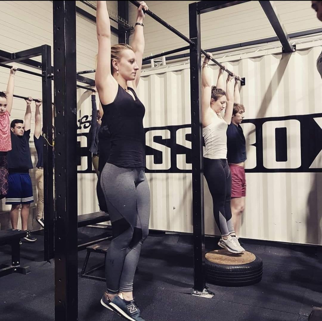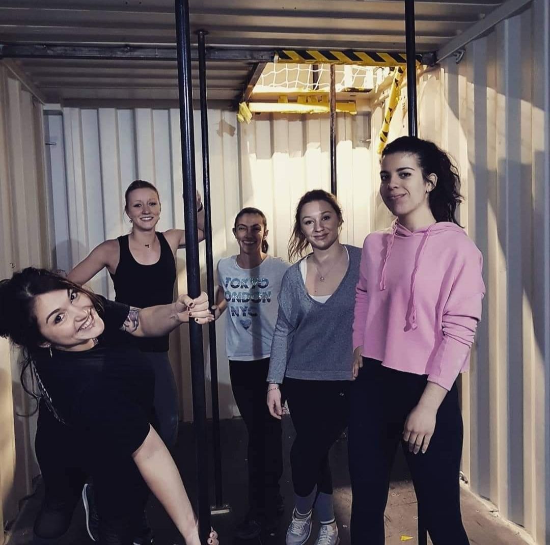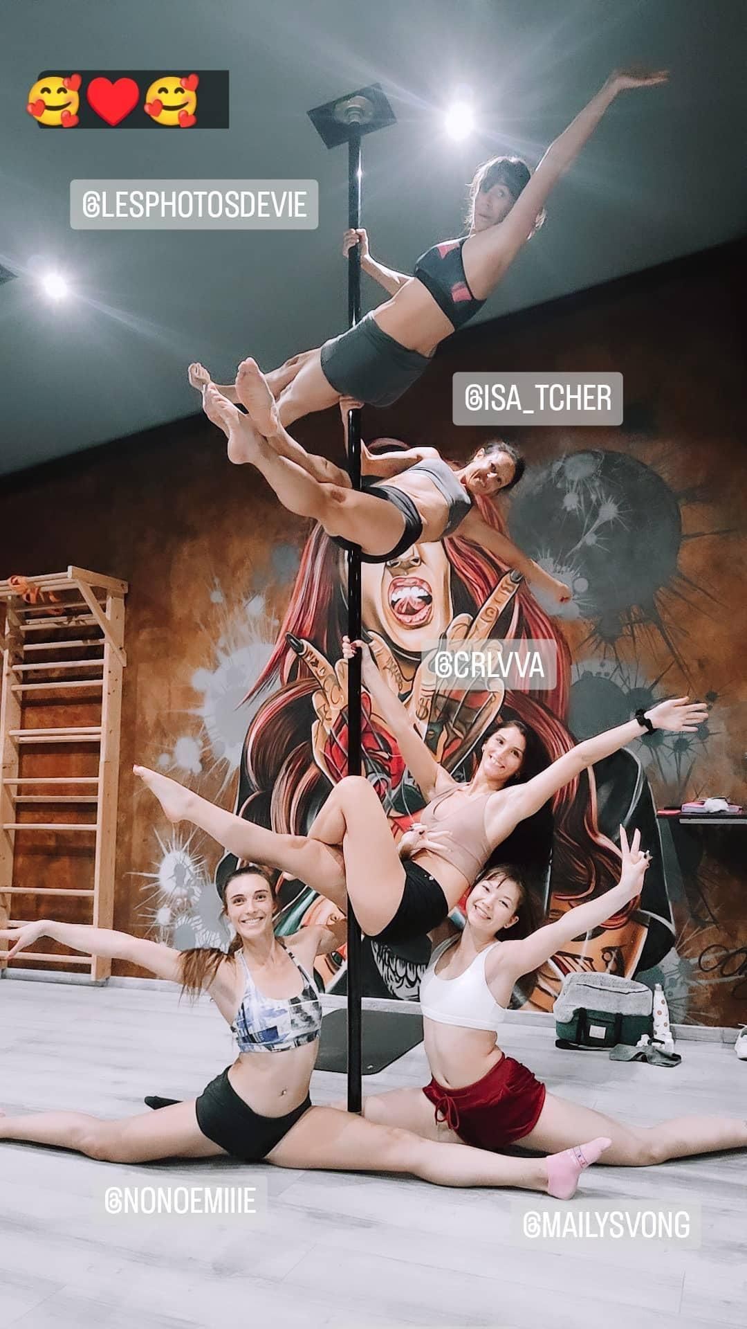 Un groupe de personnes fait de la pole dance dans une salle de sport.