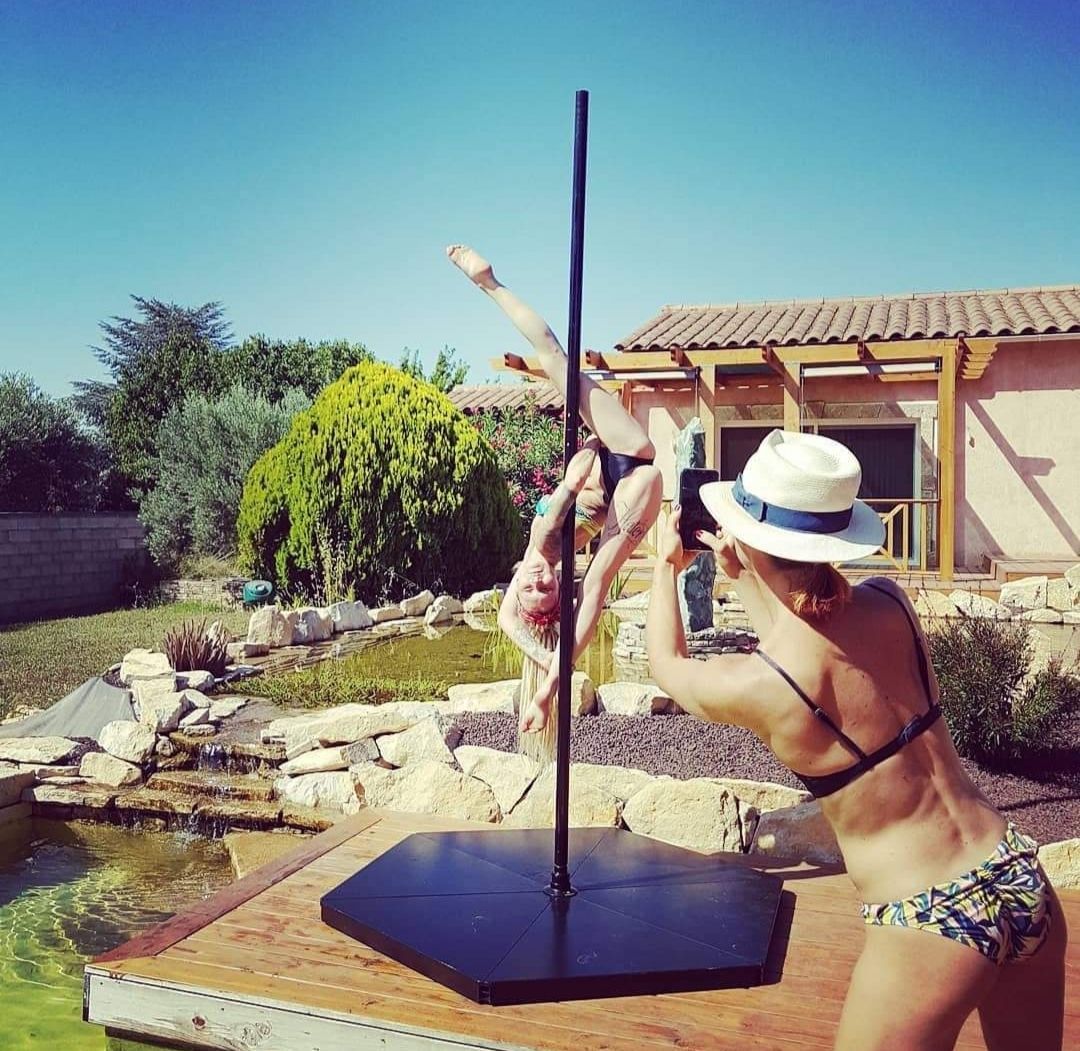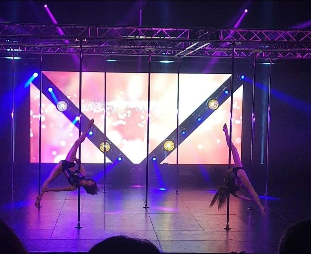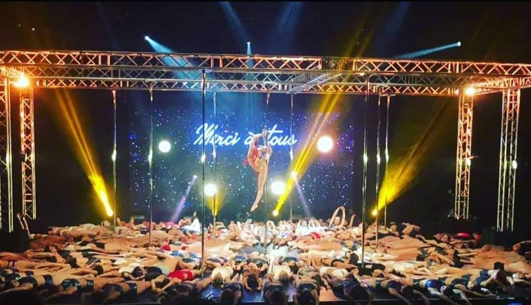 Deux danseurs de pole dance se produisent devant une foule de gens.